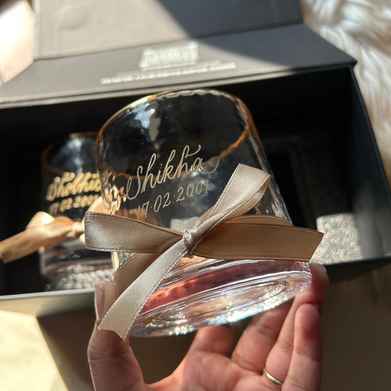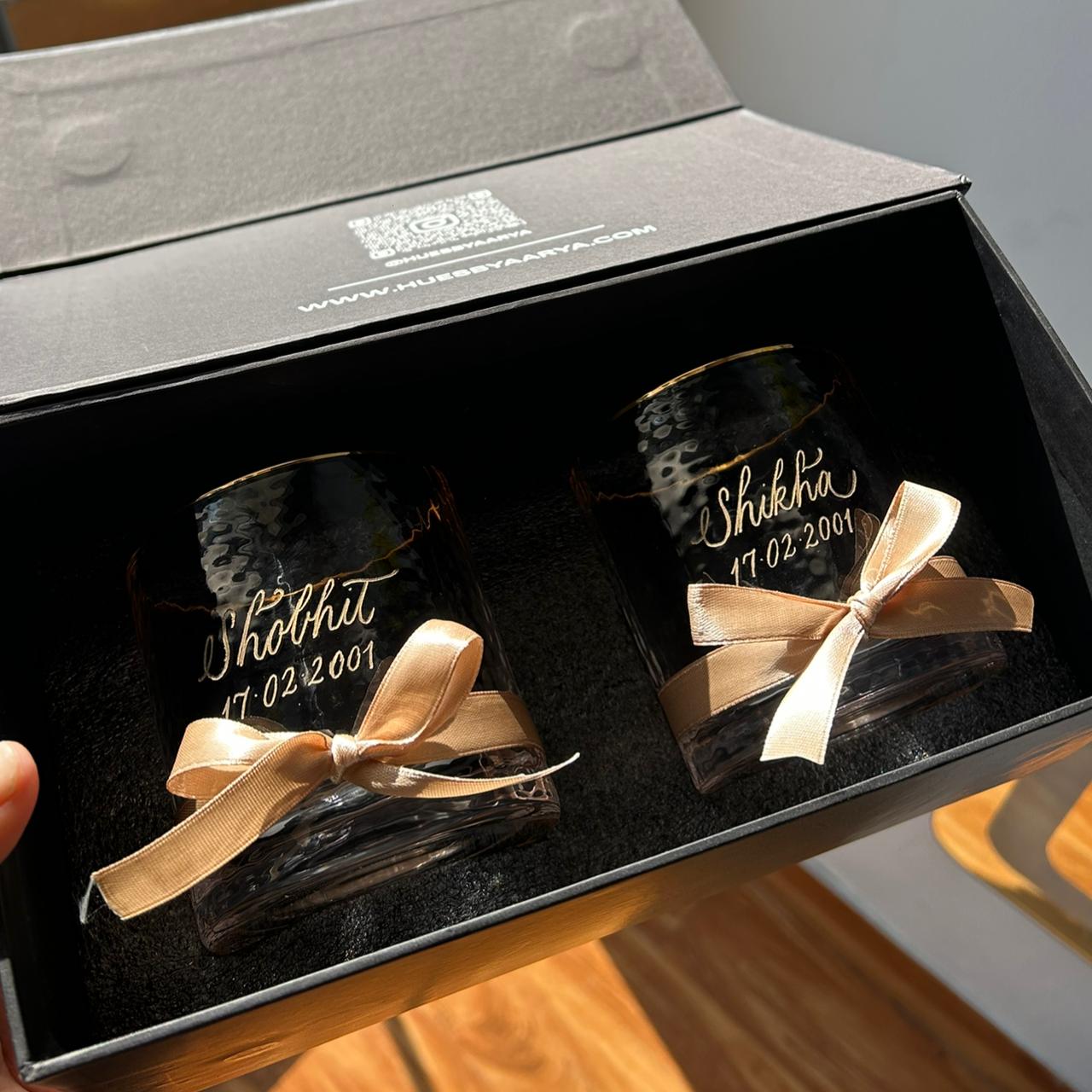 Introducing The Gentleman’s Engraved Couples Whiskey Glass Set by Hues by Aarya — a luxurious pair of hand-engraved crystal whiskey glasses, personalized with your names and a date that means everything.